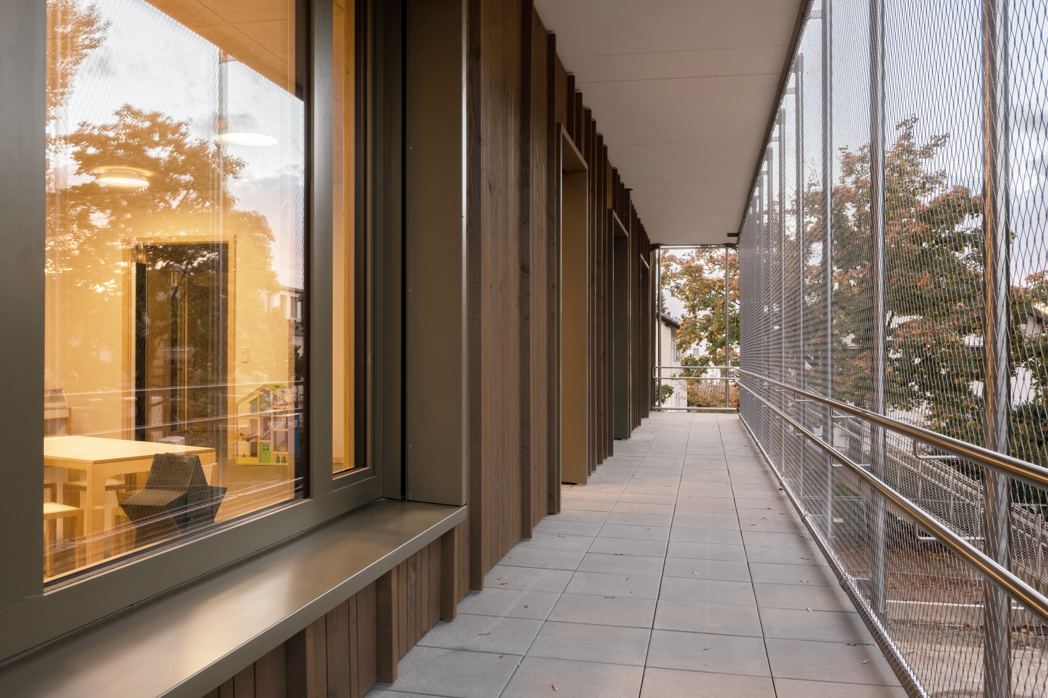 Drei Gruppenräume befinden sich im Erdgeschoss mit direktem Zugang nach außen, zwei weitere im Obergeschoss, das auch Räume für das Ganztagsangebot, wie beispielsweise einen Schlafraum, behergbergt. Durch den Erhalt des Baumbestands, den Einsatz nachwachsender Rohstoffe und eine energieeffiziente Bauweise leistet die Kindertagesstätte einen aktiven Beitrag zu einer nachhaltigen Zukunft.